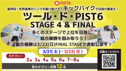 イベントスケジュールSCHEDULE 2026 03.17 Tue 休館日 休館日 2026 03.18 Wed 団体走路利用日(空) 団体走路利用日(空) 15:30~18:30残り2枠 2026 03.18 Wed 団体走路利用日(空) 団体走路利用日(空) 12:30~15:30残り3枠 2026 03.19 Thu 団体走路利用日(空) 団体走路利用日(空) 15:30~18:30残り2枠 2026 03.19 Thu 団体走路利用日(空) 団体走路利用日(空) 12:30~15:30残り3枠 2026 03.20 Fri KIDS PARK MARCHE with PIST6 at 千葉JPFドーム イベント 9:30~16:00入場無料 2026 03.21 Sat 団体走路利用日(空) 団体走路利用日(空) 16:30~19:30残り3枠 2026 03.21 Sat ツール・ド・PIST6 STAGE4 イベント 11:00~14:00入場無料 2026 03.22 Sun 団体走路利用日(空) 団体走路利用日(空) 16:30~19:30残り3枠 2026 03.22 Sun ツール・ド・PIST6 FINAL STAGE イベント 11:00~15:00入場無料 MORE SCHEDULE お知らせINFORMATION 2026.03.01 【団体走路利用】4月分の予約受付を開始しました 2026.02.28 【イベント】3月のイベント情報を更新しました 2026.02.21 【競輪選手向け 全国走路開放】3月のスケジュールを更新しました 2026.02.01 高校生走路利用(3月分)の予約受付を開始しました 2026.02.01 大学・一般団体 走路利用(3月分)の予約受付を開始しました
